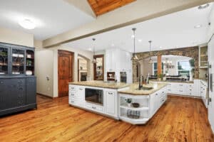 The farmhouse has been recently updated with new décor and furnishing to help create that perfect blend of comfort and style.  Upon entering the main level you are greeted with a bright and open foyer.  One entire side of this home enjoys a huge open living, dining, and kitchen layout making it the perfect place for incredible meals and amazing memories. Both in the kitchen, and other areas of the home you will find a blend of countertops at both average height and a bit lower.  If you absolutely must get some work done while staying, there are two great office spaces so you can be productive between your adventures.
