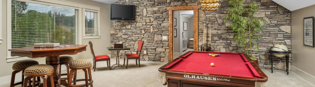 Ascending upstairs there are five additional bedrooms, two of which have en-suite bathrooms. Toward the central part of this floor is a cozy sitting area, which is perfect for reading a book or taking in the sights. One of the highlights of the home is the adjoining immense great room with billiards table (lowered slightly from standard), game tables, an elevated seating area with a huge 80" TV where you can watch your favorite movie or game.